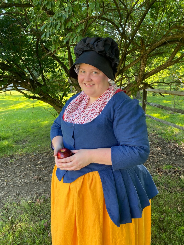 I chose a beautiful dark indigo linen from Burnley and Trowbridge for the jacket, and made a complimentary petticoat with a golden yellow linen from them as well. The block printed kerchief I am wearing is also from Burnley and Trowbridge – can you tell that I’m a fan of their products? 😉